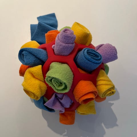 Hundebold med snor, snoren med håndtag, så der kan kastes /slynges ekstra langt, så er det bare at starte kampen, send bolden afsted, fange og siden måske trække...