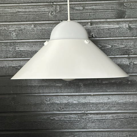 Gino Sarfatti Pendel Lampe i hvid metal. Lampen har et rundt, fladt design med en slank ophængsstang. Den er velegnet til ophæng i loftet og passer til moderne indretning.