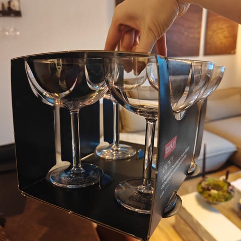Glas, Champagnefløjter og Martiniglas, "OKTETT" fra Bodum, Vintage glas fra 1980`erne med glaskumme og hvide plast stilke.