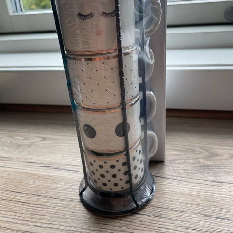Sælges helt nye kopper i hvidt stativ, mønstret