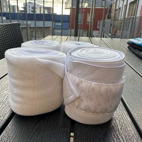 I fin stand og nyvasket. Fleece bandager der passer til både heste og ponyer. Kan evt klippes til.