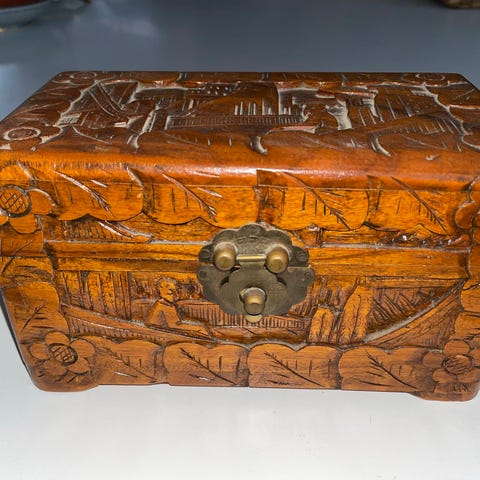 Søgeord: Kamferkiste, Kamferskrin, Kamferdåse, Smykkeskrin, Opbevaringsdåse, orientalsk, Kinesisk, Træudskæringer, Munke