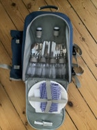 Nedsat pris!! Rummer alt til familietur. Flaskekøler på siden, fleecetæppe, der kan spændes på siden, rum til køling og rum med 4 tallerkener, 4 stk bestik, 4 glas, salt/peber, servietter, skærebræt og proptrækker.