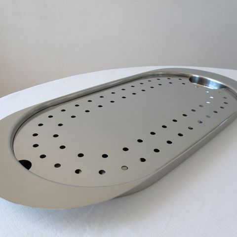 Stelton/Arne Jacobsen rustfrit stål fiskefad/serveringsfad med rist og træskærebræt – Cylinda Line