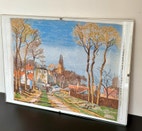Smuk ældre miniature gobelin som fremstiller en kopi af Camille Pissarro maleri. Landsby motiv.