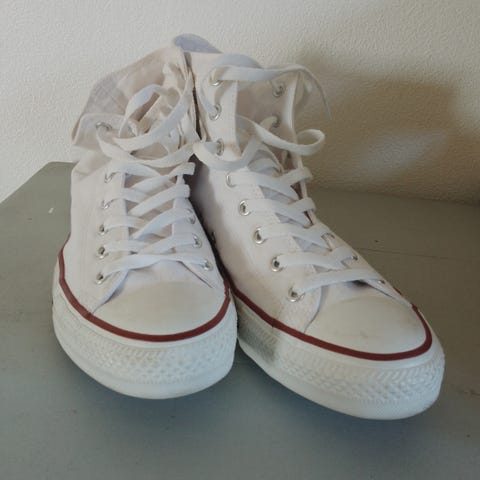 Hvide Converse Sko m/Hvide Snørrebånd og brunkant. Brugte men i god stand. Se fotos.