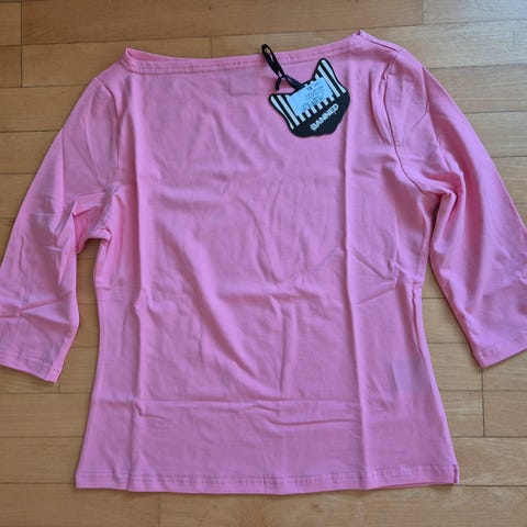 3/4 ærmer. Sød detalje med slids og sløjfe på ærmer. Klædelig bådudskæring og figursyet form.