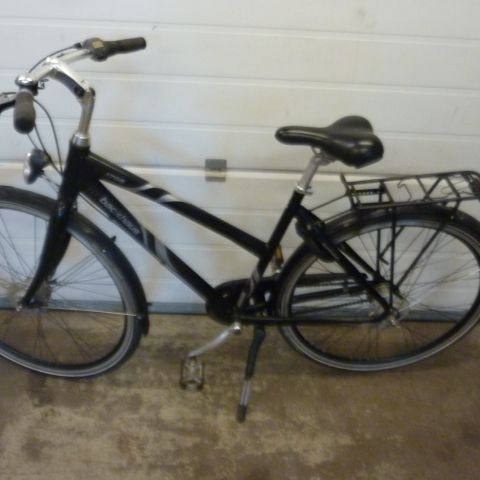 Ældre damecykel med støddæmper i saddel og forgaffel. Dynamolygte. Så at sige ubrugt. Er blevet brugt én gang og sidenhen opbevaret i en tør kælder. Virker upåklageligt.
