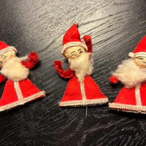 Julepynt - samling af gamle piberenser nisser, En flok gamle piberenser nisser i forskellige udførelsen. Sælges samlet for kr. 55,-.