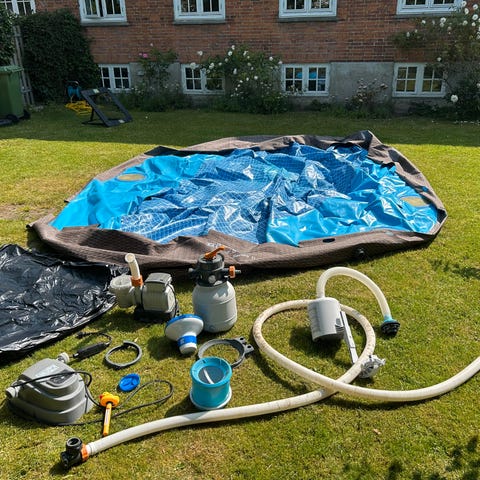 Samt ny skimmer og en pumpe osse til at tømme poolen med brugt en gang