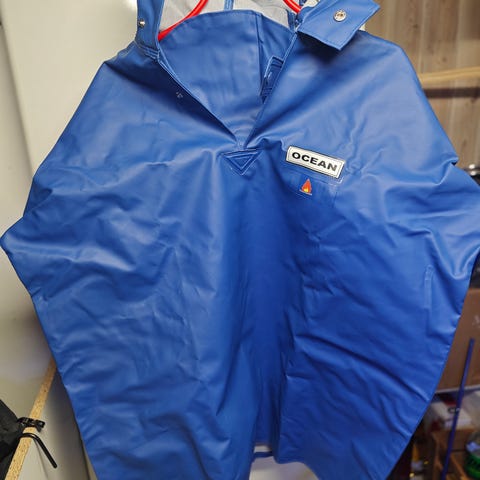 Kraftig busseronne i orange fra Ocean med refleksstriber. God til fiskeri eller andet praktisk arbejde. Matrialet er pvc gummi. Har brugsspor.