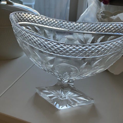 Smuk oval skål med et flot facetslebet mønster. Har en lille plet i bunden på ca 1 x 5 mm. Ses ikke tydeligt, men den er der. Derfor den billige pris. Se billederne.