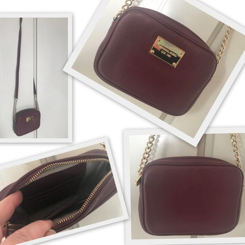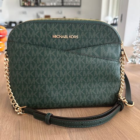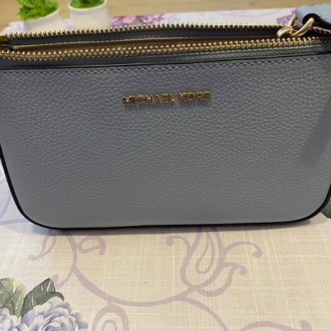 Michael Kors skuldertaske med MK‑monogram i blå nuancer. Tasken har et lodret stribet bånd foran og logo i metal. Indvendigt er der lyst foer med flere rum og lommer, herunder lynlåslomme og åbne lommer til mindre genstande. Tasken bæres over skulderen med rem og er egnet til hverdag og fritid, hvor der er behov for plads til personlige ejendele som pung, telefon og nøgler.