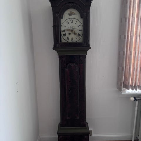 Uret fremstår med smuk patina, der passer til alderen, og fungerer som både funktionelt ur og markant møbel. Et elegant og tidløst stykke håndværk med historie.