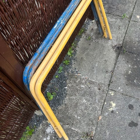 Metal/træ, en af dem er med benforlænger. Har 8 stk ialt. Pris pr stk.