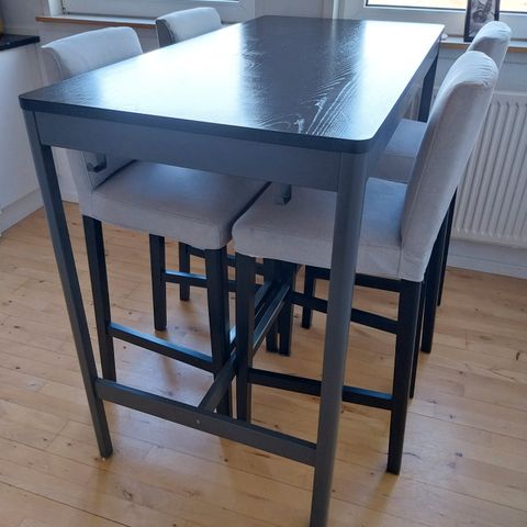 et høj bord med støbejerns fod. 115 cm høj og bordplade 70x70 cm. plade har meget lille skade på hjørne
