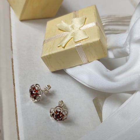 Nye øreringer med granat sten 8x6mm. Sidesten zirkoner.