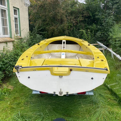 Båden er sejlklar og står som en ny jolle – klar til at komme på vandet!