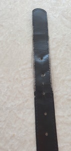 Mørkebrunt bælte. Lettere slidt men selve spændet er superflot. 96 cm langt. 2,5 cm. bredt. Evt. bruges i forbindelse med recycling eller upcycling.