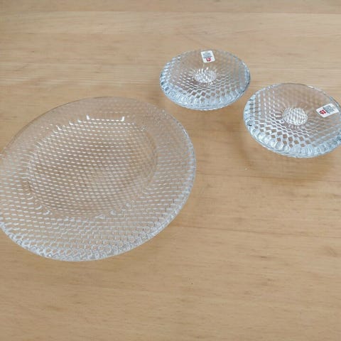 3 skåle, sæt med 2 små skåle, 4 lysestager fra Holmegaard. Pris pr stk