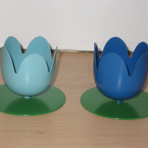 Minimalistiske harmoniske glasstager. Designblomster á la Mary Quant Flowers retro stil 70'erne. Alm. str. kronelys. Flot mørkerød, jordbærrød ligner gennemfarvede røde.