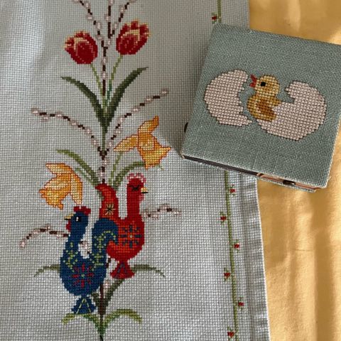 Broderet, Skønneste ca. 80 cm lange broderede påske løber i den dejligste mint grønne farve og med farverige broderede Dalar Haner.