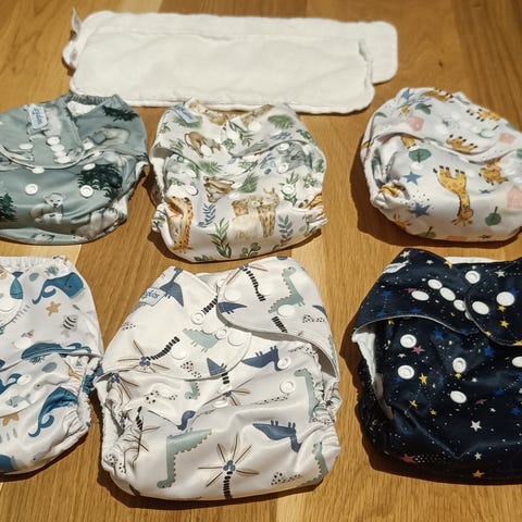 5 genanvendelige bleer fra Leeklaos og en fra ukendt mærke passer fra 0-24 måneder, fyldt med enten polyester eller bamboo indlæg.