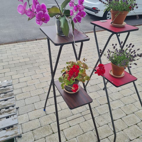 Blomsterstativ, Retro blomsterbord/stativ med jernstel og med råglasplade øverst.