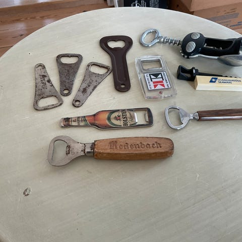 Samfundshjælper u.æske; Øl oplukker; Øloplukker, Øljern. Redskab til åbning af flasker der er lukket med kapsel. Oplukkerens lange, kegleformede skaft ligger godt i hånden og giver et sikkert greb.