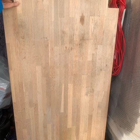 Bord i egetræ, fungerer som højt sofabord til at spise ved. Højde 63 cm, diameter 95 cm.
