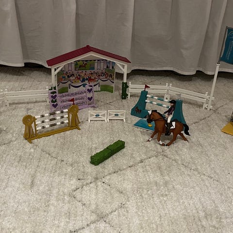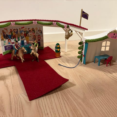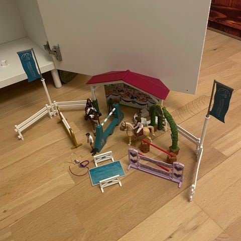 Schleich 42433 Træning til turnering. Mangler guldpokal - ellers komplet. Hestene er andre end dem på billedet, fordi Schleich jævnligt skifter heste (så disse er fra en tidligere udgave af samme sæt). Nypris 300,-