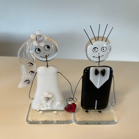 SÅ fint lavede begge to. Måler 14 cm i højden. Fin gave til brudeparret. Eller bare til at hænge op, fordi de er så søde.