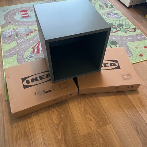 Pris for alle. PS 1014 Hylde æsker med låg i hvid plast fra Ikea. Man sætter træ dimsen op på væggen og sætter reol kassen ovenpå og så låg på. Der er 5 stk hele og noget i reserve. nogle har været brugt andre ikke.