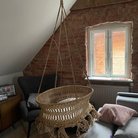 Vugge, Kurv, Leveres monteret med madras, sider og himmel, men uden understel, da det er forsvundet.
