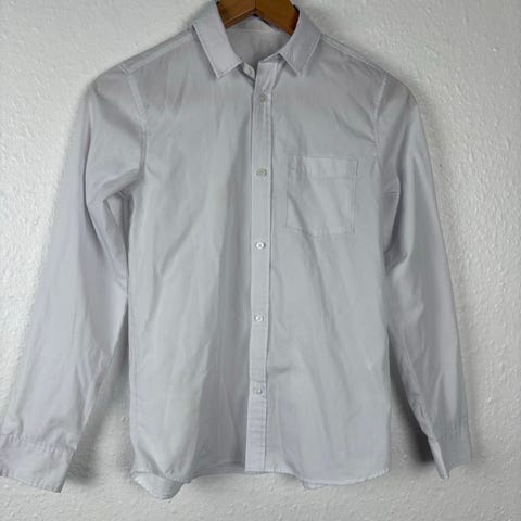 Hvid langærmet skjorte med kinakrave og træknapper. Er gennemknappet men de nederste knapper er skjult af stolpelukning.