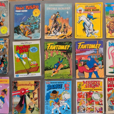 Derudover hvad der er på billederne, deriblandt det tyske nr.1 af Daffy fra 1960. 58 emner i det hele. Langt de fleste emner i rigtig fin stand. Smårevner og løse klips kan forekomme, ingen fugtskader.