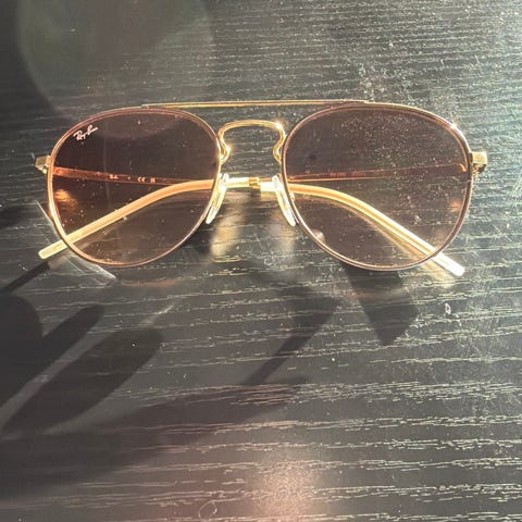 Fede klassiske aviator solbriller med guld og brun, der er gode til et lidt bredere ansigt - det er den største model. Brugte, men fin stand. De har været brugt samlet et års tid, dvs. mest en enkelt sommer og til bilkørsel, men har ikke været brugt det seneste halvandet år, da der skulle styrke på.