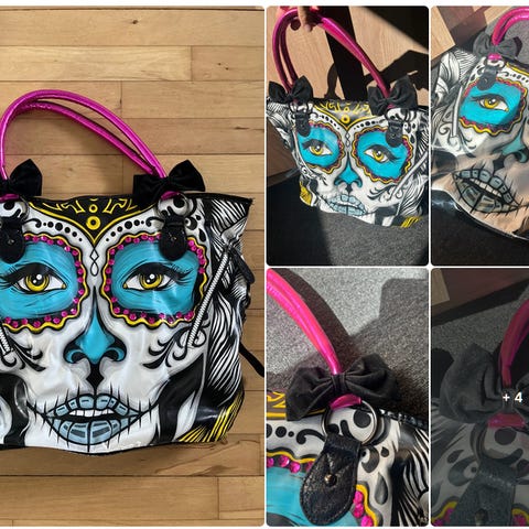 Post punk skulder- eller crossbody-taske med motiver fra punk rock tiden: Anarki, sikkerhedsnål, pirat og endelig “the guy from Exploited”, Wattie Buchans, ikoniske profil. Ca. 36x26x13 cm.