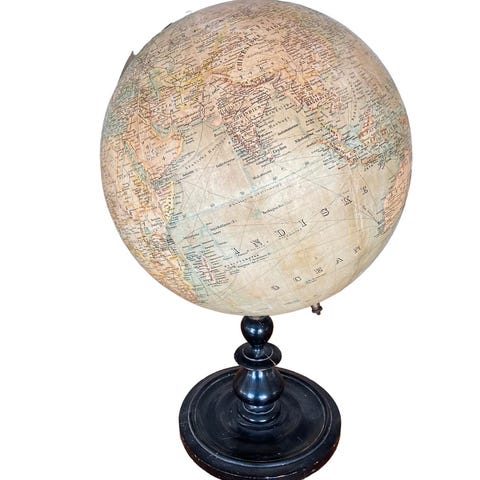 Gammel, sjov globus på smuk sort træfod. Farveangivelse af kolonier. Højde 50 cm.