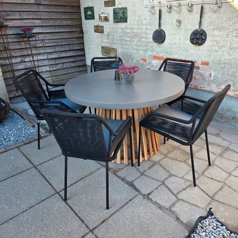 Fint bord cement top og ben I akacietræ. Total vægt 39 kg