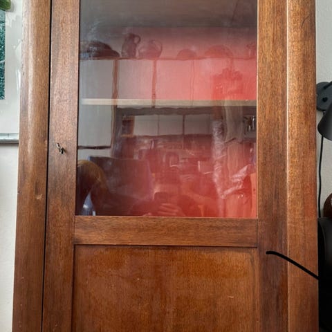 Skabet har nogle år på bagen og har brugspor men kan sagtens bruges som det er i træ men kan jo også males en god farve.