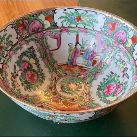 Utrolig smuk gammel kinesisk bordskål i porcelæn, Flot stand - lidt patineret slidtage på guldkanten. Højde ca. 7 cm., diameter ca. 22,5 cm.