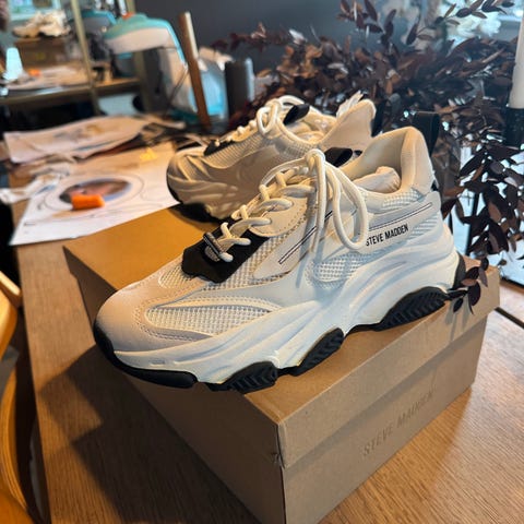 Hvide nye sneaks fra Steve Madden i str 37. Jeg købte to par fordi jeg syntes de var så fede. De holder sig dog pæne og jeg har kunne vaske dem over med en klud, så jeg sælger det helt nye par jeg har i skabet. Sålen er speciel og mega fed. Der er sten og detaljer på skoene. Nypris var 999kr.