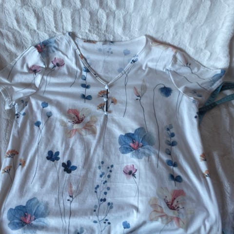 Bluse, kortærmet, 51% viskose, 27% polyester, 22% nylon, str. L. Brystmål ca. 110 cm. Helt ny- dog ingen bon. Fra røgfrit hjem. Kan sendes med gls. Køber betaler porto. Skriv på annoncen. (G)(B6)(25)