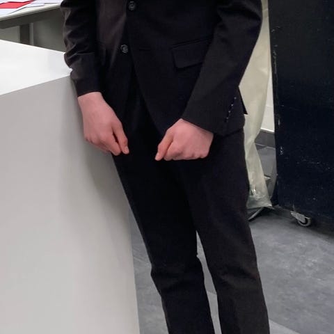 Konfirmationstøj / Festtøj til dreng str. XS, cirka 14 år eller den unge festdeltager. Jakken er mørk grå med lyse diskrete striber.