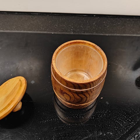 2 velholdte træ krukker . Højden er 8 cm , diam er 6.5 ( de små krydderurter man køber i supermarked , passer i )