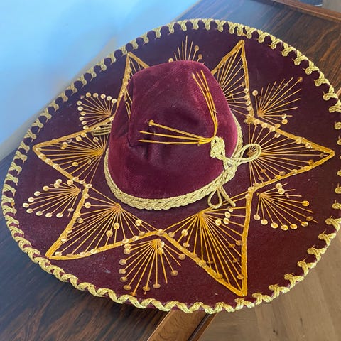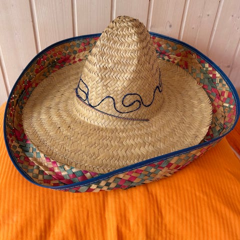 Store og flotte Sombrero hatte i naturflet. En hat måler ca. 60 cm i bredden og ca. 30 cm i højden.
