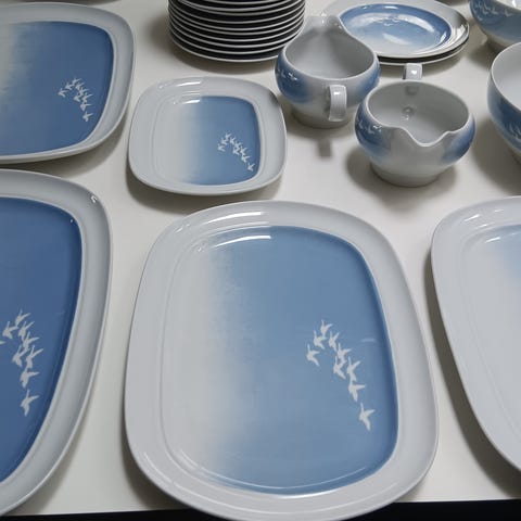 Svanestellet 1 Kaffekande, 13 kopper, 25 underkopper, 24 dessert tallerkner, 2 frokost tallerkner, 5 kuvert skåle. ( 70 dele ) Vil pynte op i ethvert sommerhus mm.