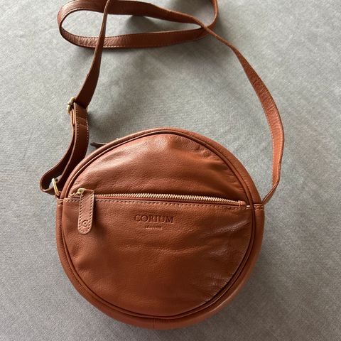 Lille rund taske i sort ruskind, med lynlås og justerbar skulderrem, 1 stort rum og 3 små lommer.