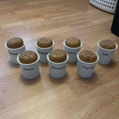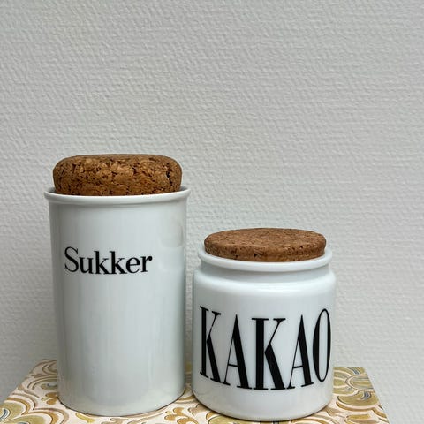 2 STORE COLDITZ KRUKKER MED KORKLÅG. TEKSTEN PÅ DEN ENE ER GRYNOG PÅ DEN ANDEN ER TEKSTEN SUKKER. DE ER 18 CM HØJE INCL LÅG. DE 2 SMÅ ER 9 CM HØJ INCL KORKLÅG. TEKSTEN PÅ DEN ENE ER SALT OG PÅ DEN ANDEN ER TEKSTEN KANEL.